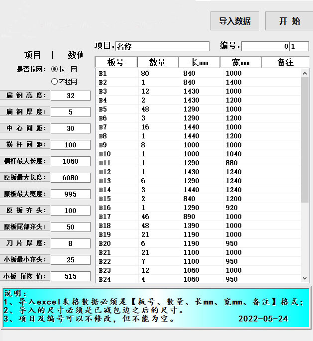 钢格栅板在钢结构平台应用非常的广泛,钢结构平台大部分都是平台乱尺和异形的,人工计算钢格栅板排版压焊切割工时非常的高,本公司研发一款钢格栅板自动排版软件,只需要填写钢格栅板规格型号,然后把尺寸单导入软件内,软件快速的自动生成钢格栅板压焊切割方案。